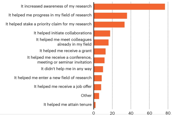 当被问及在bioRxiv发布论文对职业发展的帮助时,78%的受访者表示,这提升了其研究成果的知名度。