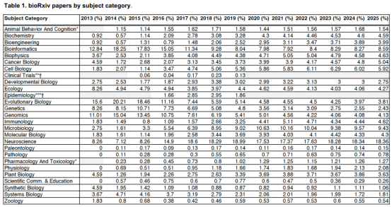 bioRxiv 平台论文按学科分类 图源:《bioRxiv:the preprint server for biology》