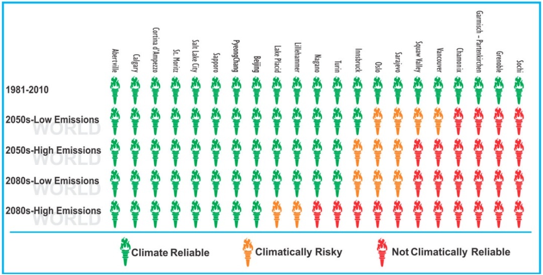 研究显示,即便按照联合国设定的最佳气候情景(全球快速削减温室气体排放),到本世纪中叶,有4座往届主办城市会因气候条件不稳定而无法持续承办冬奥会。若全球继续高比例燃烧化石燃料,美国加利福尼亚州斯阔谷、加拿大不列颠哥伦比亚省温哥华两地也将加入这一行列。而到21世纪80年代,22个往届举办场地中,将有12个因气候条件不稳定,无法承办冬奥会户外项目。